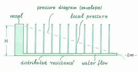 By the way, we can derive this idea from the well-known hydraulic analogy (plumbing) that we can see everywhere around us. For example, imagine a large vessel filled of water that supplies a long thin pipe; let's first the pipe to be tapped. The question is: "What is the pressure inside the pipe?" And more precisely speaking, "What are the local pressures along the pipe?"