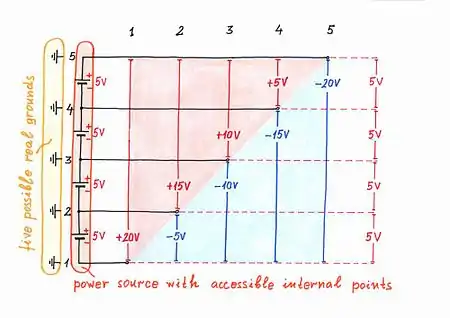 Ground. Now, let's say also some words about ground. But what is ground? We can find a possible answer in the Wikipedia article about virtual ground. Shortly, ground is a reference point, regarding to which we measure voltages. The PC power supply that we use is the so-called "split supply". It consists of two 12 V supplies connected in series (- + >>> - +). The middle point serves as ground in this arrangement. The DAC's grounds are connected internally to this ground. We have also to connect the black test ends of our voltmeters to this ground.
