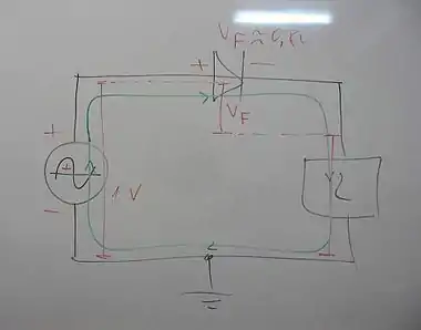 So let's make the diode perform as a rectifier and thus participating in a half-wave rectifier circuit (the sircuit diagram is shown on the left). We have a sinusoidal source (for the experiment it is 1V) and a resistive load.