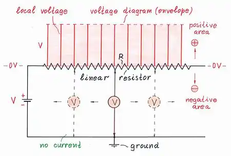 Let's now apply this powerful idea to draw the analogous electrical voltage diagrams. The idea is obvious: if we think of voltage as a kind of pressure, we may present the local voltages by local voltage bars in exactly the same way as we have presented the local pressures along a pipe by a local water bars! As above, the lengths of the voltage bars are proportional to the magnitudes of the local voltages regarding to ground (we might set the zero voltage level at the height of the resistor and then to draw the positive voltage bars above and the negative voltage bars below the resistor's level). The set of these voltage bars forms the whole voltage diagram. We can use the envelope of the voltage diagram instead the very set of voltage bars, in order to simplify the image.