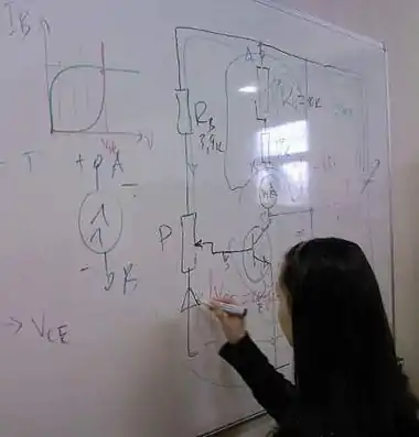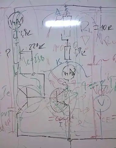 Then what does a transistor actually do? Well, look at the last picture (on the left) of your colleagues from the previous Group 66b. As you can see, we have drawn arrows going out of the transistor. They represent the heat that the transistor was dissipating since they were made a short connection in the collector circuit. So, I ask you again, "What does the transistor do? As you can see, we have broken the three-terminal transistor into two 2-terminal devices and now we discuss the one of them - the output collector-emitter "device". Here is this "device", I have held it. It has two leads and it is connected by these two leads in an electrical circuit... I ask you again, "What does it do in this circuit?", "What does the transistor do with its output part?"