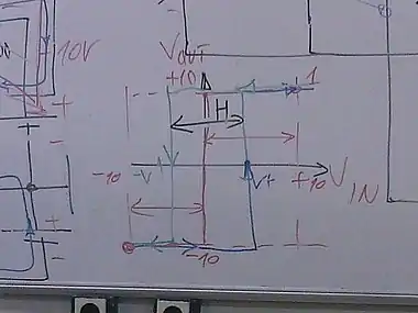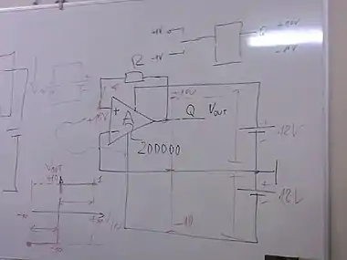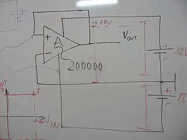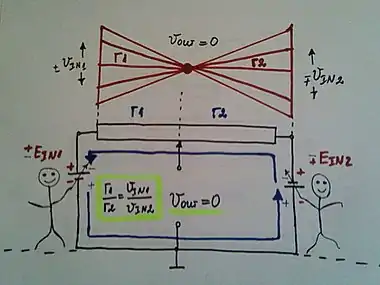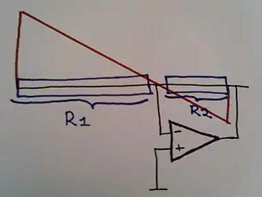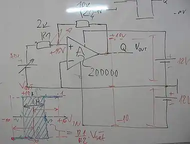 If we have voltages with different polarity and VIN1 and VIN2 are selected so that VOUT=0 (point known as "virtual ground") we have a comparing device,like in the scheme in the third picture:VIN2/VIN1 = -(r2/r1).To keep Vout = 0 we can use operational amplifier(down).Here I1.R1=(VIN/R1).R2 or VOUT/VIN=-R2/R1.