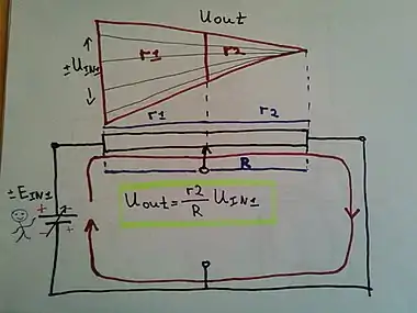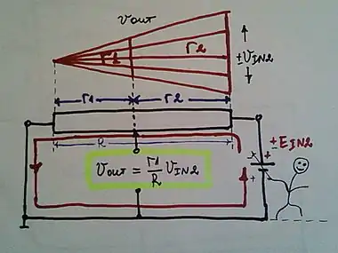 In this lab exercise we tried to "invent" new analog devices using our knowledges for the famous Ohm's experiment. In order to see the graphics of our "new" devices, we used Microlab - PC Apple2 connected to 4 DACs and 4 ADCs. We made a couple of experiments and these are the schemes we were analysing. First the voltage source is connected only to the one end of the resistor and we measure the potential along the resistive layer(1st picture). Thus we make a linear transference-to-voltage converter.