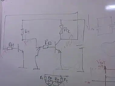 Operation. How does our circuit operate? When we put the circuit into operation the transistor on the left is inactive. However, current which is high enough to activate the transistor on the right flows through resistor Rc1 (remember we've connected a voltage source). Its emitter-base junction is forward biased and therefore we have output which is equal to the ground potential. This output influences the first transistor's input but it is not high enough to activate the first element. We continue to have a logical "1" on its output which keeps the situation in our circuit exactly the same as it was before. And wasn't that what we wanted to happen in the first place?