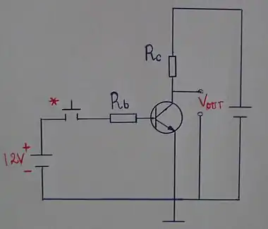 Here is where we start. We have a bipolar junction transistor, whose emitter is common to both the input and the output. The input is controlled by the transistor's base and its collector serves as the output. We control the input with the button marked with *. When the button is pressed the input circuit is closed and the transistor is active. When the button is not pressed the transistor is inactive and we can not get any output signal.