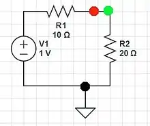 The original voltage between green and black is going to be the same voltage between red and black. The total Resistance will be r1+r2.