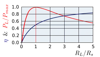 The graph below shows the power in the load (as a proportion of the maximum power, Pmax) and the efficiency for values of RL between 0 and 5 times Rs.