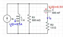 Example34 ... used in wikibook circuit theory .. parallel RLC current source, 2 initial conditions, find current through capacitor leg