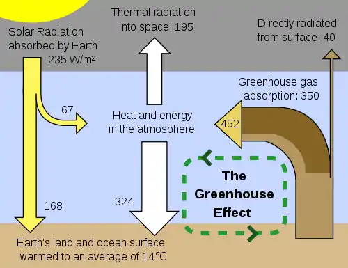 Out of 46 units received by the earth, 9 units are directly released back to space by longwave radiation without heating the atmosphere. Six units of the longwave radiation are absorbed by clouds, water vapour, carbon dioxide and ozone. The total energy used up in heating the atmosphere is 60 units; 37 units released by the earth surface (7 units –sensible heat; 24–units latent heat and 6 units absorbed by clouds, water vapour, carbon dioxide and ozone) and 23 units already absorbed during transmission of the solar energy (19–units absorbed by water vapour, dust particles and ozone and 4 units –absorbed by clouds).