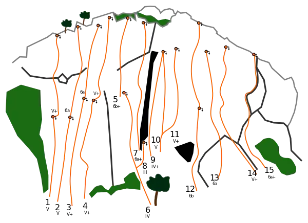 - The full route are mostly longer than 35m. Follow the map and always climb down by the signed places