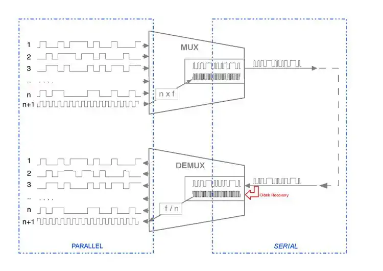 - Therefore, at the transmit side it is possible to identify some circuitry that converts from parallel to serial (the MUX) and some circuitry at the opposite end converting from serial to parallel (DEMUX).