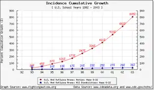 While ASD includes many subtypes and often the numbers can be underestimated because of variability, Figure 4 gives an overview of prevalence and incidence rates in the United States (1993-2003). This suggests ASD continues to be persuasive and increasing exponentially (compared to other disabilities). While ASD is the most common of the developmental disabilities, the second most prevalence learning disability is attention deficit hyperactivity disorder.