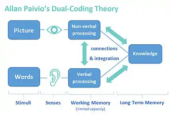 Allan Paivio’s Dual-Coding theory separates audio and visual information, stating a human’s mind analyzes visual and verbal responses in separate independent codes [17]. According to Mayer’s multimedia model, learning, primarily enters the human brain through words and images. In fact, visual imagery, when compared to verbal texts that require a person to generate a kind of imagery in one’s mind, provided a more reliable and retention in memory [18]. Mayer’s research indicates that through the simultaneous use of images and words, learning becomes much more meaningful. In order to test this statement, many researchers conducted studies to find correlations for improved performance though the use of multimedia learning principles. A brief review of the research conducted by Billie Eilam and his colleagues will be examined as an example. Eilam conducted an experiment involving 150 college students, whereby participants were evenly divided into two groups. Each individuals received the same amount of cards required to perform a given homework. Group one received cards that were printed in texts, while the second group received information in both text and images, such as graphs. Results indicated that the latter group performed much more accurately compared to the first group [19]. Experiments performed by Eilam and his colleagues, as well as other studies, were designed to determine and assess learning strategies as a means to improving student’s learning, in relation to how information is processed through the human’s memory system.