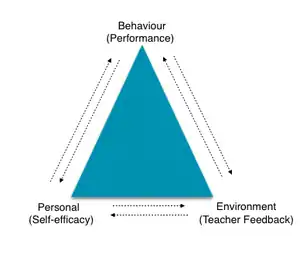 Since self-concept and self-efficacy, though distinct constructs, are related in their conception and in their effects on student achievement, consideration is given first to the literature on self-concept as a basis for observations on self-efficacy. Self-concept is generally viewed as an assessment of self-worth deriving from comparisons with the past performance of self and the performance of others.[3][4] Self-efficacy tends to be conceptualized as a context-specific assessment of one’s competence to perform a specific task. Self-efficacy theory suggests that feelings of self-efficacy have their origins in experiences of success or failure that arise through attempts to master actual tasks. In brief, Self-efficacy is how the individual perceives ones own abilities and the level of confidence for achieving goals from the perceived abilities. There are three domains of self-efficacy that differentiates in: task difficulty, generality of one's self-efficacy (self-efficacy in one domain is not consistent with self-efficacy in another domain), strength of one's efficacy judgments. Within those three domains, there are four factors that Bandura stated to effect self-efficacy. These factors are enactive mastery, vicarious experience, verbal persuasion, and physiological and effective state. Enactive mastery is related to the knowledge that an individual has obtained from previous experience. For example, if an individual has achieved mastery in math they are more likely to have a high self-efficacy. Achieving mastery contributes to the individual’s perception of ones ability in completing a task. Vicarious experience is watching others and learning from what was watched[5]. For example, if an individual watches a classmate or teacher demonstrate an equation on the board they may feel their ability to the problem on their own has increased. There will be more discussion related to this in the section entitled enactive and vicarious learning. Another factor is verbal persuasion which is having an individual convince another that they are capable of completing a task. Having another person or classmate tell another that they have the ability to do well on a task or encourage them, might boost their confidence and their perception of their ability on a task. The final factor, physiological state, can effect the individual’s self-efficacy. For example, if an individual is tired due to a lack of sleep, their perception of their ability to complete a math task might be low. Even though they normally have high self-efficacy in math. These four factors as well as others affect the individual’s self-efficacy.[6][7] As self-efficacy is closely related to the concept of reciprocal determinism in ways that the personal, environmental, social aspects influence self-efficacy and vice versa, this part of the chapter will look closely at the different aspects and implications of self-efficacy and factors that will correlate with each other.