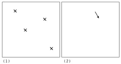 Only four years later, Finke and Pinker published a counter model. Picture (1) shows a surface with four dots, which were presented to the subjects. After two seconds, it was replaced by picture (2), with an arrow on it. The subjects had to decide, if the arrow pointed at a former dot. The result was, that they reacted slower, if the arrow was farer away from a dot. Finke and Pinker concluded, that within two seconds, the distances can only be stored within a spatial representation of the surface.