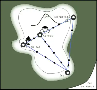 In 1978, Kossylyn expanded his image screening experiment from objects to real distances represented on maps. In the picture you see our island with all the places you encountered in this chapter. Try to imagine, how far away from each other they are. This is exactly the experiment performed by Kossylyn. Again, he predicted successfully a linear dependency between reaction time and spatial distance to support his model.