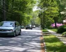 T: Texture, shading, saturation. Because of the air that light passes through, distant objects are more hazy, with less saturated colour and more blue.[15] We also use texture gradients. In the car picture, the shadows of the trees on the street are relatively uniform, but the shapes get smaller as the road goes into the distance. Also, we assume that brighter-lit things are facing upward, and their downward sides are in shadow. This helps us see surfaces as concave or convex (bumping away from us or toward us.)