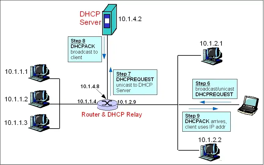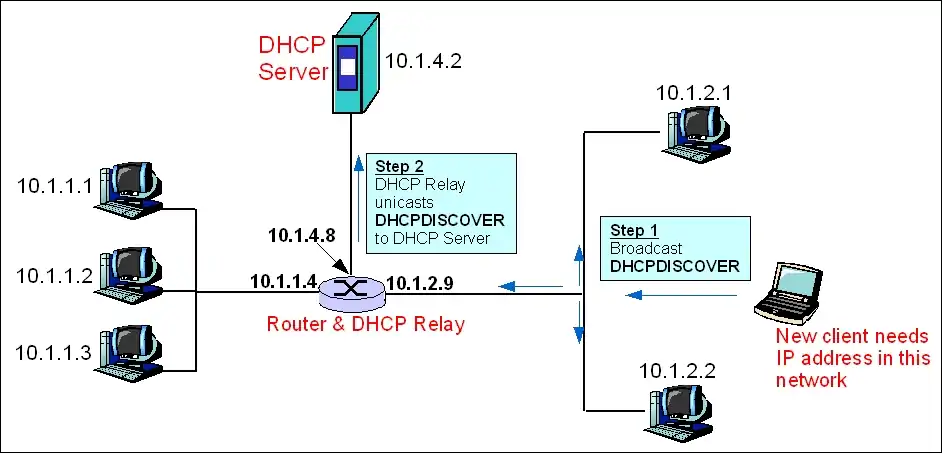 In figure 1, a new client that just joined the network, needs an IP address. Since it does not know the DHCP server's location, the client broadcasts (step 1) a DHCPDISCOVER message on the local network. The message packet contains a hardware identifier (usually the MAC address), the source port (68), the destination IP (255.255.255.255), destination port (67), and a randomly generated transaction id. Optionally the client can specify the IP address it wants and the lease duration in the message. Once the DHCP relay receives the broadcasted message, it fills in the "giaddr" field of the packet with the gateway IP address of 10.1.2.9 . This piece of information is critical because the DHCP Server needs it to determine which subnet the client is on and thus which IP address to allocate to the client. Afterwards the DHCPDISCOVER message is relayed to the DHCP Server via unicast (step 2). A unicast, instead of a broadcast, is sufficient because the DHCP relay knows the exact location of the DHCP server. For this same reason, the DHCP relay does not allow the other network segment, 10.1.1.X, to receive the message.