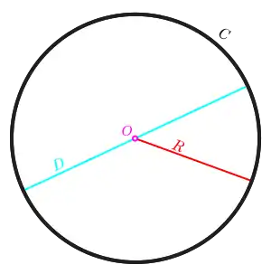 Circle illustration with circumference (C) in black, diameter (D) in cyan, radius (R) in red, and centre or origin (O) in magenta.