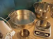 Cooking implements: beaters, large bowl, cup measurement and large cake tin. Scales optional.