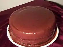 - Immediately 'frost' the cake with this, and make sure that there is quite a bit between the two layers of cake. The cake will need to be refrigerated to harden the fudge, so don't worry about its relatively liquid nature.