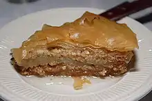 - Continue until all nut mixture is used and last six (6) buttered sheets of Phyllo form top crust.