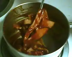 The ideal meat to use would be thin slices of eye-of-round beef roast. The sauce also goes well with chicken, turkey, and pork.