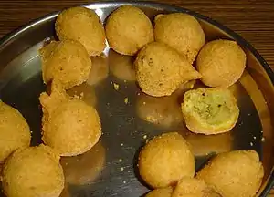 Once the batter and filling are ready heat some oil to fry in a deep pan. You will need at least 1½ inch (4 cm) layer of oil to deep fry. Take the golf sized balls of filling, dip it in the batter making sure the ball is completely coated and drop it into the oil. Fry until it becomes golden and remove.