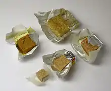 A bouillon cube (US) or stock cube (UK and Australia) is dehydrated broth (bouillon in French) or stock formed into a small cube about 15 mm wide. It is made by dehydrating vegetables, meat stock, a small portion of solid fat (such as hydrogenated oil), salt (usually well over 50%) and seasonings (usually including monosodium glutamate) and shaping them into a small cube. Dehydrated broth is also available in granular form.