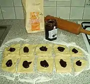 - When ready, take the dough and put it on a clean, floured surface. Roll the dough to 1cm thickness. Divide it so that you get equal quads of about 4 x 4 square centimeters each. Fill each quad with your favorite jam. Bind the 4 angles of the quad and roll it in your hand. Place the small heaps side by side in a baking pan. Cover them with a cloth once more and let them rest for 20 minutes, then put them into the oven.