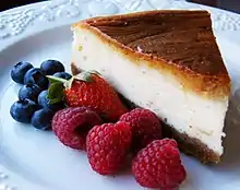 A cheesecake is a baked cheese custard (with egg), or an unbaked cheese confection without egg. There are many recipes for this dessert with ingredients varying from cream cheese to ricotta cheese to a healthier cottage cheese (for a 'lighter' version). Some cheesecakes have a crust comprised of crushed cookies, (ranging from the traditional graham cracker crust, a shortbread crust, chocolate cookie crust-the possibilities are endless) and some cheesecakes have no crust. Once the basic recipe and technique is learned, the cheesecake can then serve as a base for many variations.