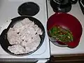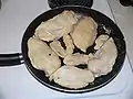 While mushrooms and peas are frying, flour the chicken