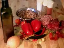 Chili con carne (in America shortened to chili) is a spicy stew-like dish, the essential ingredients of which are beef, pork, venison, or other mature meat, and chili peppers. Variations, either geographic or by personal preference, include the addition of tomatoes, onions, beans, and other ingredients. (Brown sugar is often a favorite condiment). There are also many versions of vegetarian chili, also known as chili sin carne, made without meat (sometimes with a meat substitute). The name "chili con carne" is a slight corruption of the Spanish chile con carne, "chili with meat". Chili con carne is the official dish of the U.S. state of Texas.