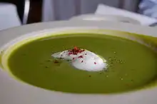 Chilled asparagus soup with crème fraiche and pink peppercorn