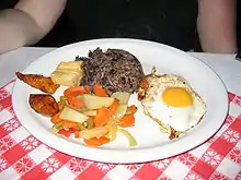 For lunch, the traditional national dish is called a casado. It again consists of rice and beans, though this time they are served side by side instead of mixed. There will generally be some type of meat (carne asada, fish, pork chop or chicken) and a salad to round out the dish. There may also be some extras like fried [plantain]s, a slice of white cheese, and/or corn tortillas in accompaniment.