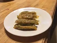 Egyptians are famous for stuffing spicy rice in vegetables like green pepper, aubergines, courgettes and tomatoes to make Mahshi (Arabic: محشي). Mahshi is generally rolled in grapevine leaves, Mahshi Warraq Enab (Arabic: محشي ورق عنب), or in cabbage leaves, Mahshi Koronb (Arabic: محشي كرنب).
