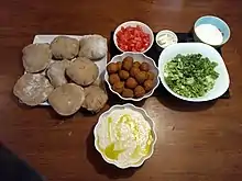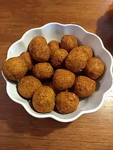 Falafel is a fritter popular in Mediterranean cuisine. It is typically fried, but may also be baked. It always consists of one or more types of beans; usually fava beans or chickpeas. In some regional varieties parsley is added too.