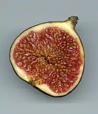 The fig is actually a flower inverted into itself, sometimes needing to be pollinated by a wasp that crawls inside through the bottom hole.
