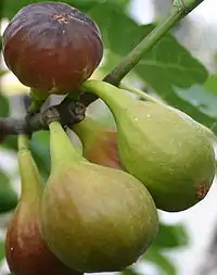 The fig is a fruit. Though exquisite when fresh and ripe, it spoils far too quickly to make fresh fruit practical. Figs are usually available in dried form. There are two main types of fig, the small dark ones (mission figs) and the large pale ones (all others: calimyrna, kadota, brown turkey, etc.). Most dried figs are mission figs, but the other types generally taste a little better.