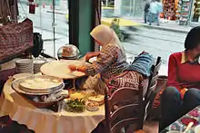 Gözleme is a savoury traditional Turkish flatbread dish, made of hand-rolled dough that is lightly brushed with butter and eggs, filled with various toppings, sealed, and cooked over a griddle. The name derives from the Turkish word "göz", meaning "compartment", in reference to the pocket of dough in which the various toppings are sealed and cooked. Traditionally, this is done over a saç griddle.