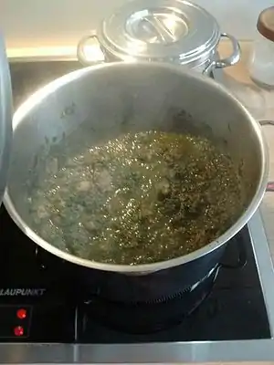 - Chop the parsley and spinach into fine pieces and add it to the pot, together with the herbs from the can