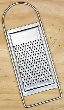 A grater is a kitchen utensil that is usually made from metal (and sometimes ceramic or even wood), with sharp perforations or protrusions used to shred food. Graters come in various sizes: from those with larger perforations which are often used to shred cheese and vegetables, to the very fine graters and micro planes that can be used to zest citrus fruit. Micro planes are preferred by many for their efficiency in producing finely grated food. Fresh ginger or wasabi graters are usually made from porcelain or bamboo, and use spikes or ridges to tear those fibrous rhizomes (they are not clogged with fibres like conventional graters).