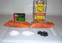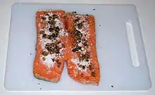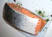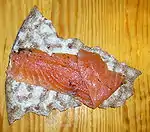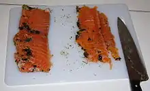 Gravlax is salmon that is cured in salt and sugar. It is a common dish throughout Scandinavia. Gravlax is easy to make and makes a festive dish that is an excellent to serve at parties with many people. The process of curing fish in salt and sugar (grava) is not limited to salmon and works fine with any fatty fish although salmon is definitely the most common choice. Gravlax has been particularly popular and common in the northern regions of Scandinavia whose cold and fresh waters produce salmon of excellent quality. The basic recipe here has been used for generations and has its origins in the northernmost part of Sweden. Gravlax can be used either as a main dish or as an appetizer.