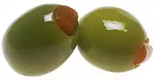 The green olive is a pickled olive, normally stuffed with a pimento but sometimes containing the pit, an anchovy, an almond, or nothing at all. Green olives are usually sold in glass jars.