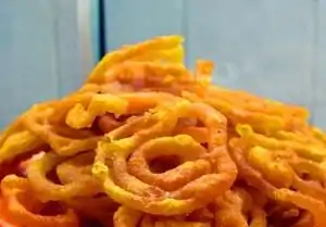 Jalebi is a syrupy sweet that is shaped like a slightly large, chaotic pretzel and is traditionally prepared in India and Pakistan. Well-made jalebi has a tart element with a sweet taste.
