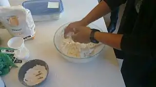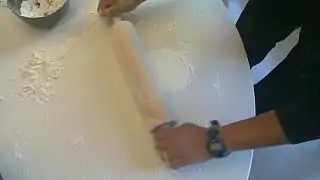 Putting flour on a flat table, in preparation for rolling out the dough.