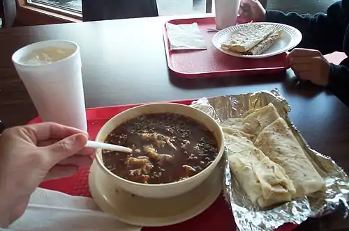 Menudo is a traditional Mexican dish; a spicy soup made with hominy and tripe.