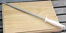 A steel usually consists of a hardened steel rod with many tiny grooves scored lengthwise. Seemingly paradoxically, they can also be made from a ceramic material specifically intended for sharpening hardened knives, as a standard steel can quickly become blunted. Another version is the diamond steel, with tiny specks of industrial diamond dust bonded to its surface. These are very effective for both sharpening and honing the edges of knives, but they tend to wear away at the knife far more quickly than do other kinds of steel.