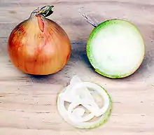 Onion in the general sense can be used for any plant in the genus Allium but used without qualifiers usually means Allium cepa, also called the garden onion. Onions (usually but not exclusively the bulbs) are edible with a distinctive strong flavour and pungent odour which is mellowed by cooking. They generally have a papery outer skin over a fleshy, layered inner core. Used worldwide for culinary purposes, they come in a wide variety of forms and colors (but generally brown, white or purple).