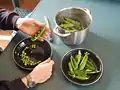 Dried peas are often made into a soup or simply eaten on their own. Fresh peas are often eaten boiled and flavored with butter as a side dish vegetable. Fresh peas are also used in pot pies, salads and casseroles. Pod peas (particularly sweet varieties called mangetout and sugar peas) are used in stir fried dishes.